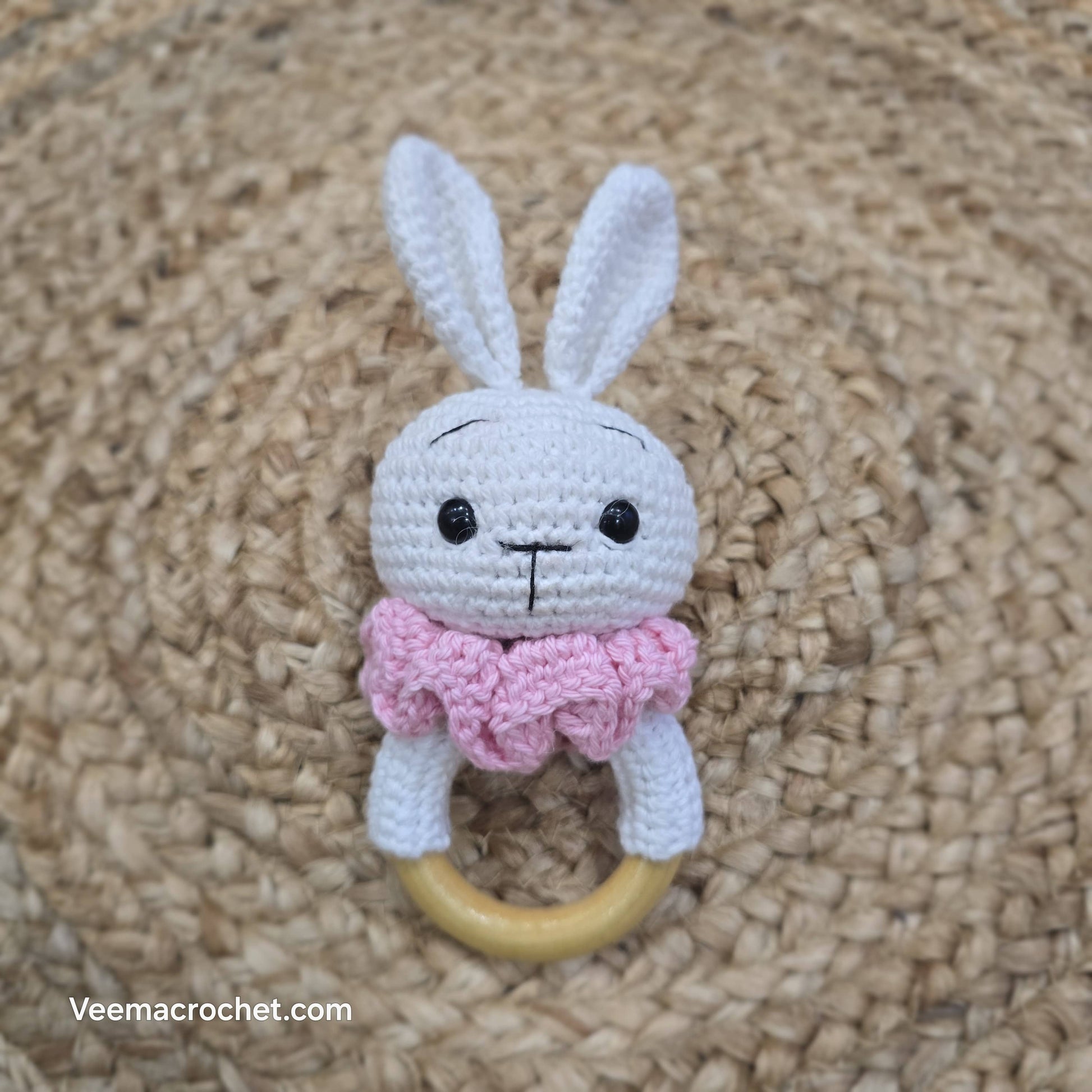 Soft, sweet, and soothing—this handcrafted bunny rattle features gentle white ears, stitched eyes, and a frilly pink collar, all securely attached to a smooth wooden ring for easy gripping. Designed for tiny hands and teething comfort, it’s a charming companion for playtime, naps, or gifting. A lovingly made piece from Veema Crochet that blends cuteness with tactile delight.